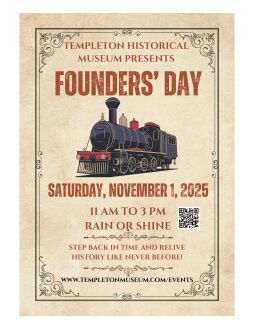 The Templeton Historical Museum Society will host a celebration of Founders' Day, the 1886 arrival of the first passenger train in Templeton. This day marked the town as the southern terminus of the train line from San Francisco to Los Angeles.