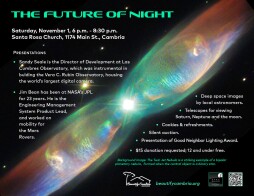 The Future of Night is a fun and educational family event. There will be remarkable deep space photos shown on a 135” movie screen and two outstanding speakers: Dr. Sandy Seale, Director of Development at Las Cumbres Observatory (LCO) in Goleta and Jim Bean, engineer from NASA’s JPL.